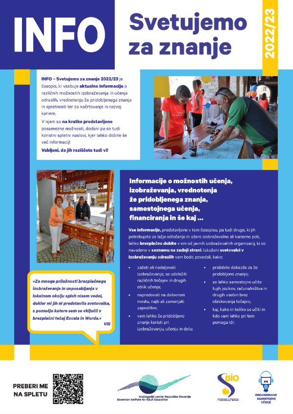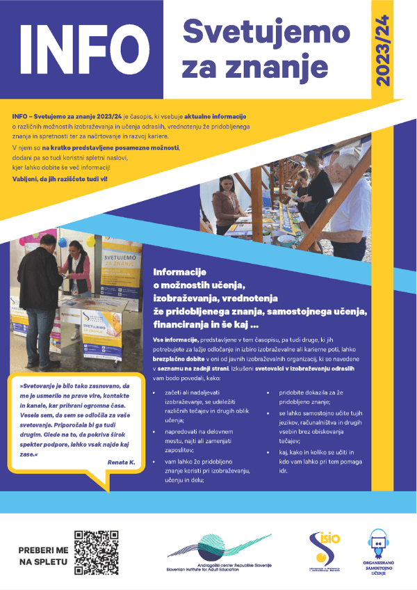 INFO – Svetujemo za znanje 2023/24 je časopis, ki vsebuje aktualne informacije o možnostih učenja, izobraževanja, vrednotenja že pridobljenega znanja...