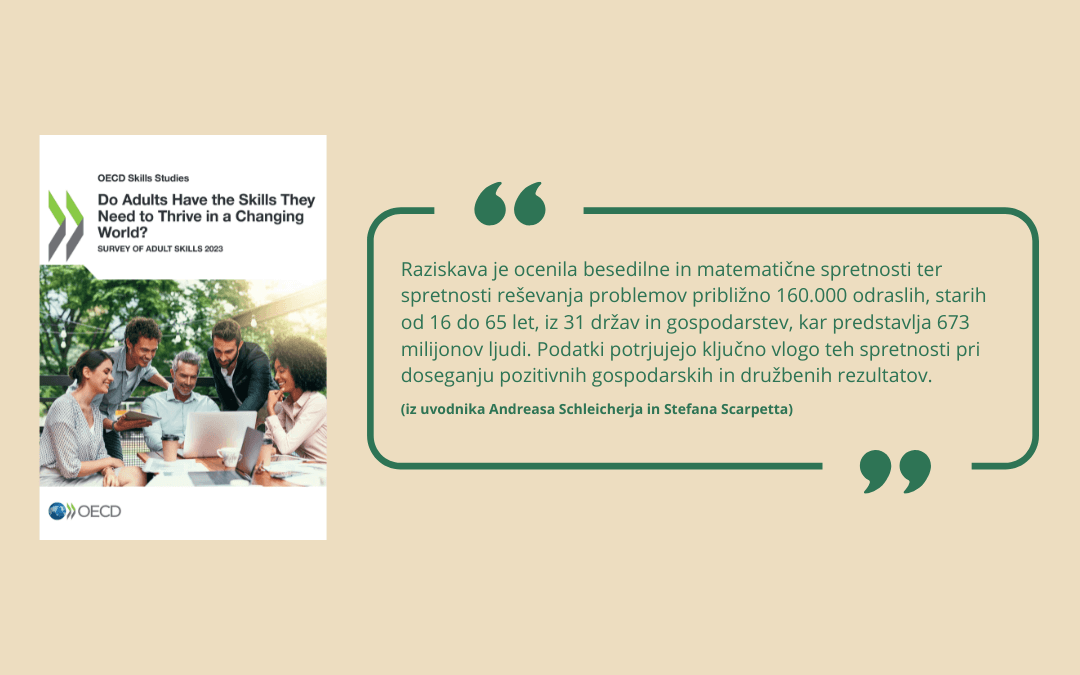 OECD je 10. decembra predstavila rezultate zadnje raziskave o spretnostih odraslih (PIAAC 2023). Pokazali so mešano splošno sliko spretnosti odraslih. Ocenjevali so spretnosti odraslih na treh področjih: besedilne in matematične spretnosti ter spretnosti reševanja problemov.