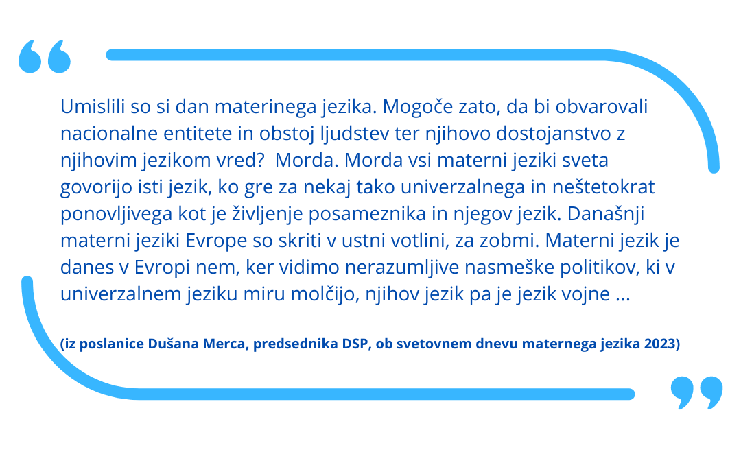 Mednarodni dan maternega jezika pa obeležujejo tudi v Društvu slovenskih pisateljev (DSP). Danes zvečer ob 19.30 uri pripravljajo v Stekleni dvorani Lili Novy (Cankarjev dom) literarni dogodek, na katerem bodo nastopili ustvarjalci, ki se vsak dan gibljejo med slovenskim in italijanskim jezikovnim oz. starem istroromanskem prostorom.