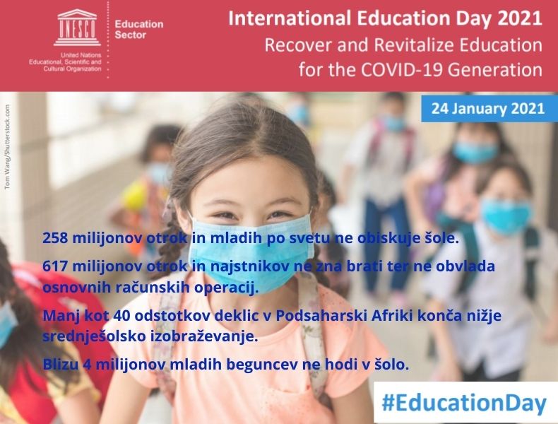 Generalna skupščina Združenih narodov je z resolucijo 24. januar razglasila za mednarodni dan izobraževanja. S tem je želela poudariti pomen izobraževanja za mir in razvoj. Brez vključujočega, pravičnega in kakovostnega vseživljenjskega učenja in izobraževanja za vse državam ne bo uspelo doseči enakopravnosti spolov in prekiniti začaranega kroga revščine, zaradi katerega puščamo ob strani na milijone otrok, mladih in odraslih.