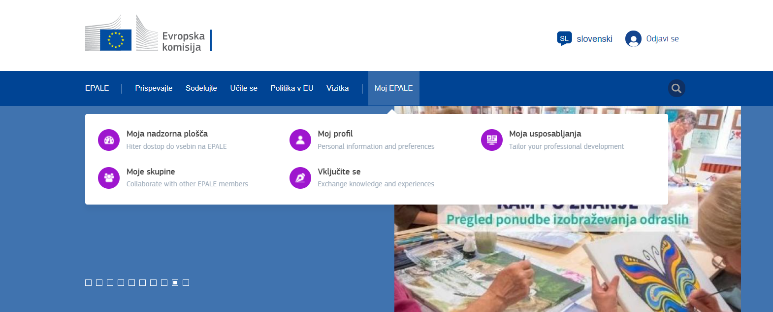 MOJ EPALE je najnovejša menijska opcija, ki ponuja personifikacijo profila: omogoča hiter dostop do vsebin na EPALE – Moja nadzorna plošča, v razdelku Moj profil urejate svoje podatke, Moja usposabljanja so osebni prostor, namenjen vašim usposabljanjem in izbranim učnim gradivom, preprosto lahko dostopate do skupin, v katerih sodelujete – Moje skupine; v rubriki Vključite se vabijo k izmenjavi znanj in izkušenj.