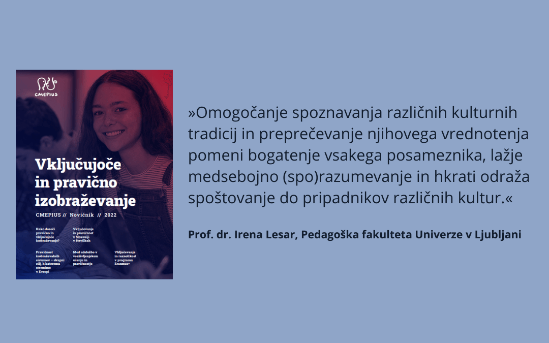 V teh dneh je CMEPIUS izdal Novičnik 2022. V celoti je posvečen eni od prednostnih tem novega programskega obdobja Erasmus+ – vključevanju in raznolikosti. V njem boste našli strokovne prispevke na temo vključevanja, inkluzije in pravičnosti v slovenskem pa tudi širšem izobraževalnem prostoru. Spomladanski Novičnik je hkrati tudi povabilo k sodelovanju na jesenski konferenci Vključevanje, inkluzivnost in pravičnost v vzgoji in izobraževanju, ki bo 27. in 28. septembra na Brdu pri Kranju.
