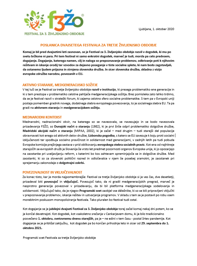 V Sloveniji smo mednarodni dan starejših 19 let zapovrstjo obeležili s Festivalom za tretje življenjsko obdobje (F3ŽO). Glede na epidemiološko situacijo v državi so se organizatorji odločili, da jubilejnega dogodka letos ne bo. Kot so zapisali v sporočilu za javnost »moramo v teh časih vsi paziti nase in biti odgovorni do vseh okoli sebe. Verjamemo, da bo naslednje leto za dogodke končno stabilno in zopet polno življenja.«