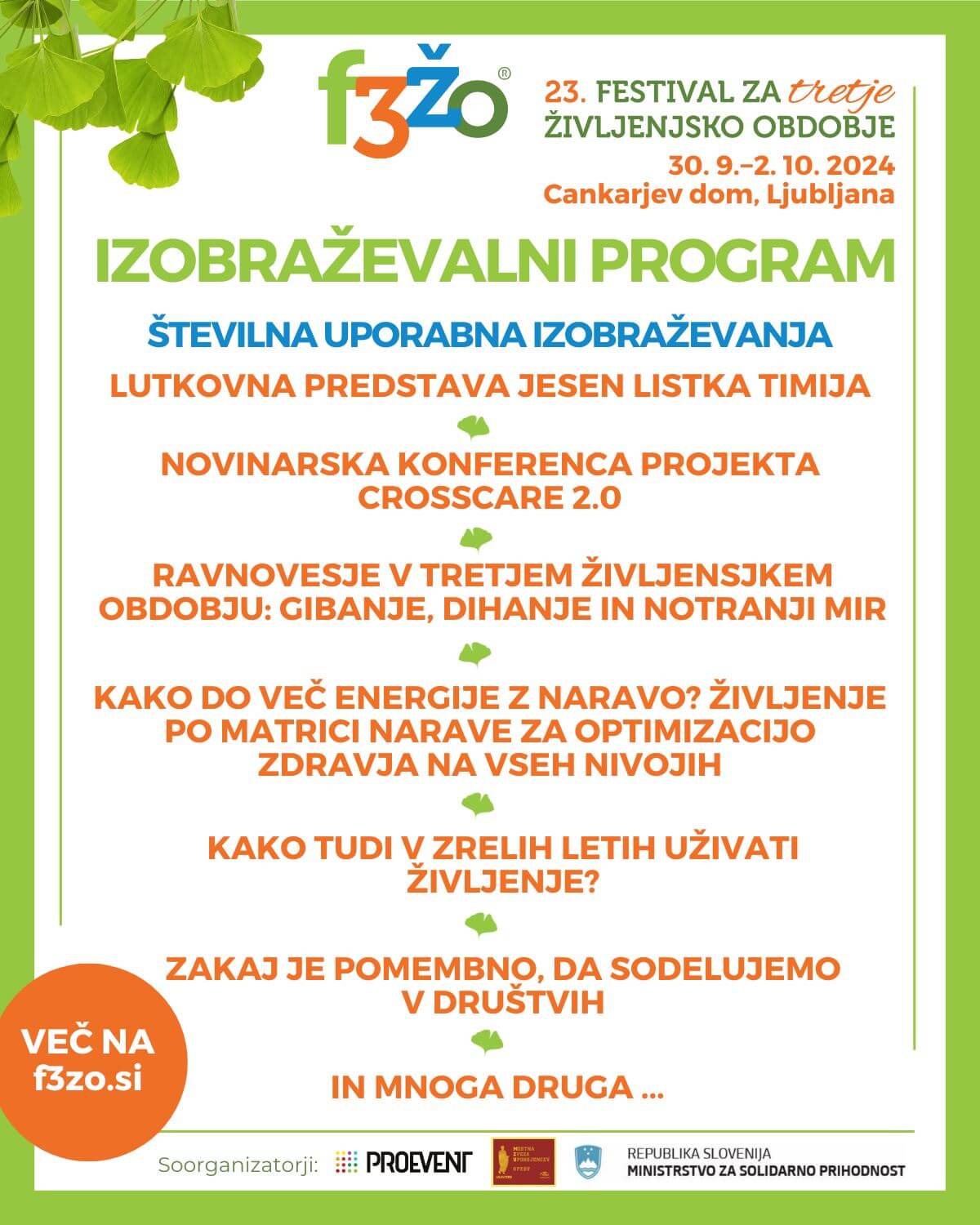 F3ŽO tudi letos ponuja zanimive izobraževalne dogodke, polemične strokovne razprave in številne delavnice ter natečaje za vse generacije. Festival je od samega začetka posvečen aktivnemu staranju, izboljšanju kakovosti življenja starejših in uresničevanju solidarnosti med generacijami – ravno zato ves program poteka pod geslom Vsi smo ena generacija! Na ogled bo tudi bogat kulturni program na različnih prizoriščih.
