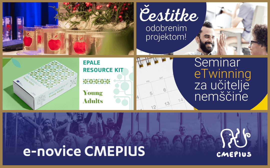 Ob koncu decembra so izšle zadnje lanske e-novice CMEPIUS. Na prvo mesto postavljajo čestitke odobrenim projektom jesenskih razpisov za akciji KA122 na področju splošnega izobraževanja odraslih (IO) in KA210.