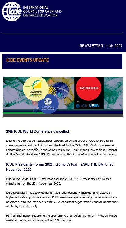 Zaradi izjemnih razmer, ki jih je povzročil koronavirus, Mednarodni svet za odprto izobraževanje in učenje na daljavo (International Council for Open and Distance Education – ICDE) v svoji najnovejši številki novičnika sporoča, kako bodo izvedli načrtovane dogodke. 29. svetovno konferenco ICDE, ki bi jo morali organizirati v Braziliji, so odpovedali, Forum predsednikov ICDE 2020 bodo 25. novembra 2020 izpeljali virtualno, vrh vodstva ICDE 2020 pa je preložen na začetek leta 2022.