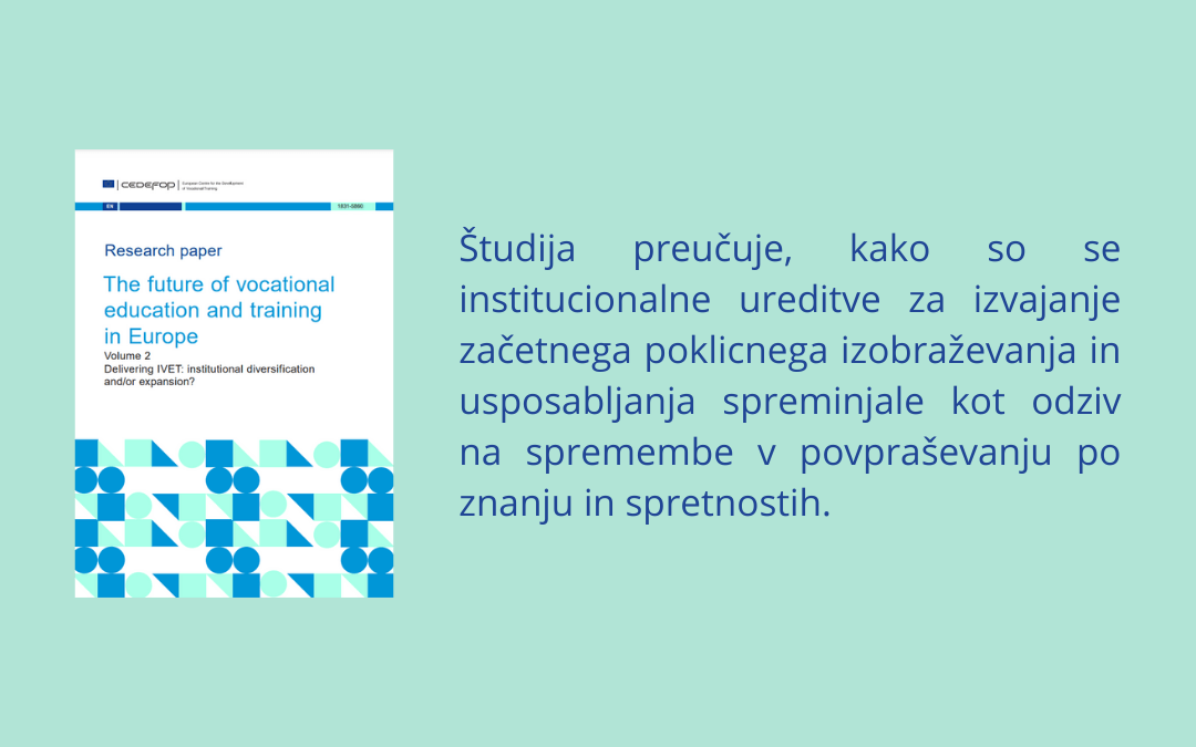 Študija s podnaslovom Delivering IVET: institutional diversification and/or expansion? temelji na vseevropski raziskavi ponudnikov poklicnega izobraževanja in usposabljanja ter poglobljenih nacionalnih študijah primerov. Daje vpogled v nenehno spreminjajoče se okolje poklicnega izobraževanja in usposabljanja. Čeprav se ureditve med državami razlikujejo, je mogoče ugotoviti skupne trende, kot je institucionalna hibridizacija, brisanje meja med začetnim poklicnim izobraževanjem in usposabljanjem ter splošnim izobraževanjem.