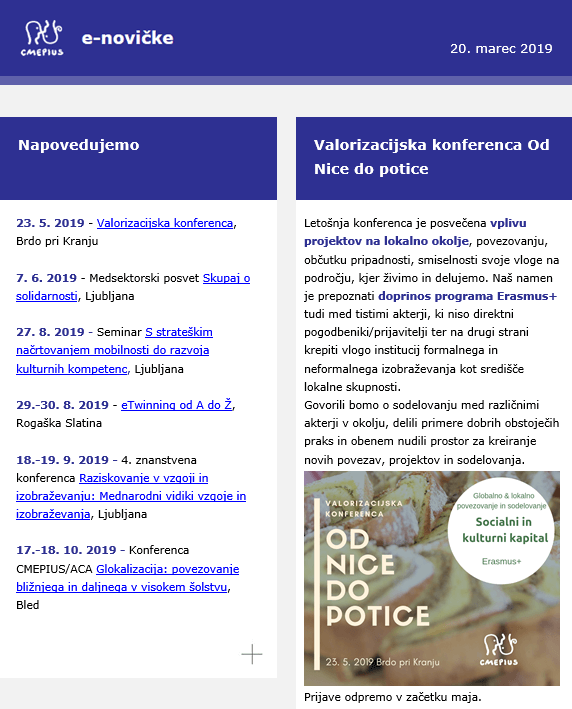 CMEPIUS svojo najnovejšo izdajo glasila namenja napovedim dogodkom; med drugim vabijo na Valorizacijsko konferenco Od Nice do potice, ki bo 23. maja na Brdu pri Kranju, in na 4. znanstveno mednarodno konferenco 2019, ki jo Pedagoški inštitut prireja v sodelovanju s SLODRE in CMEPIUS 18. in 19. septembra 2019.