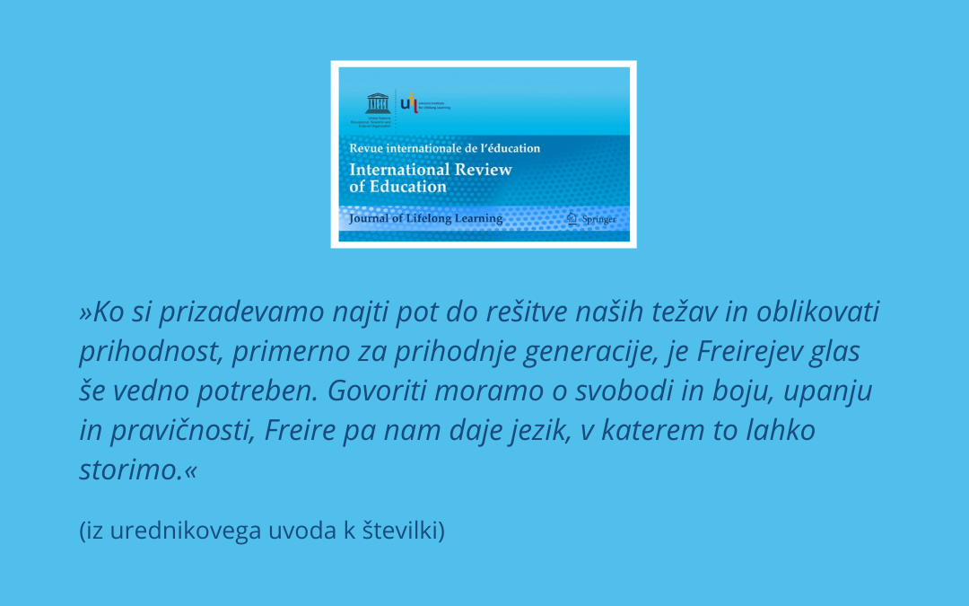 Oktobrska številka revije International Review of Education – Journal of Lifelong Learning (IRE) obeležuje stoletnico rojstva Paula Freireja. Njegove zamisli o svobodi in osvoboditvi ter odnosu med razmislekom in delovanjem v izobraževanju še vedno navdihujejo in izzivajo 50 let po objavi njegovega temeljnega dela Pedagogika zatiranih. Izobraževanje, ki ljudem omogoča, da se kritično ukvarjajo s svetom okoli sebe, in prinaša možnosti za družbene spremembe, je zdaj nujno potrebno.