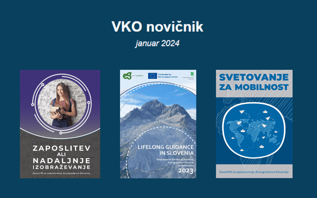 V rubriki Gradiva VKO predstavljajo tri zbornike: Zaposlitev ali nadaljnje izobraževanje, Lifelong guidance in Slovenia ter Svetovanje za mobilnost.