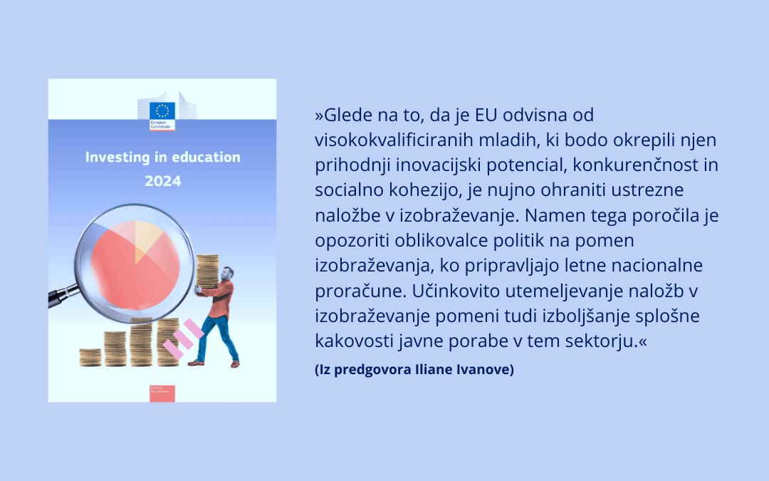 Na spletni strani Evropske komisije je objavljena publikacija z naslovom Investing in Education 2024. Najnovejše primerjalno poročilo ponuja obsežno analizo trenutnega stanja in prihodnjih potreb po vlaganjih v izobraževanje v EU.