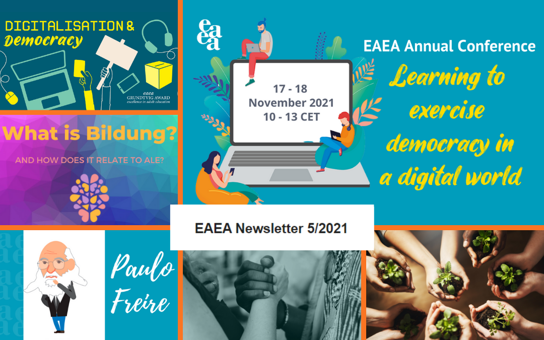 Napovedujejo letno konferenco EAEA, ki bo povezala dve temi – digitalizacijo in demokracijo. Če želite razpravljati o vlogi izobraževanja odraslih pri digitalnem državljanstvu, se pridružite letni konferenci, ki bo 17. in 18. novembra 2021. Več informacij o programu bo na voljo kmalu.