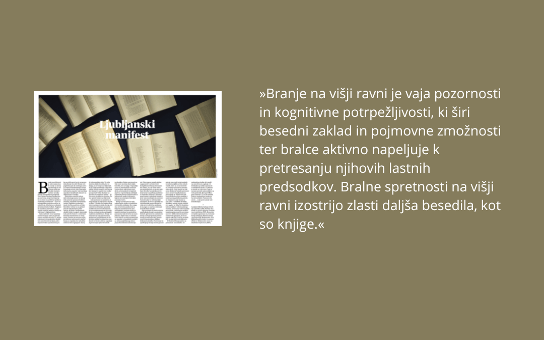 V torek, 10. oktobra 2023, je bil v časopisih Delo in Frankfurter Allgemeine Zeitung objavljen Ljubljanski manifest o branju na višji ravni. Manifest poudarja pomen knjižnega branja v digitalni dobi. Predstavitev dokumenta bo eden od stebrov programa častnega gostovanja Slovenije na mednarodnem knjižnem sejmu v Frankfurtu.