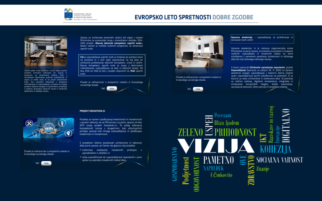- projekt Inovativen.si – od leta 2017 ga izvajajo na Ministrstvu za javno upravo in je namenjen spodbujanju kreativnosti in inovativnosti v javnem sektorju.