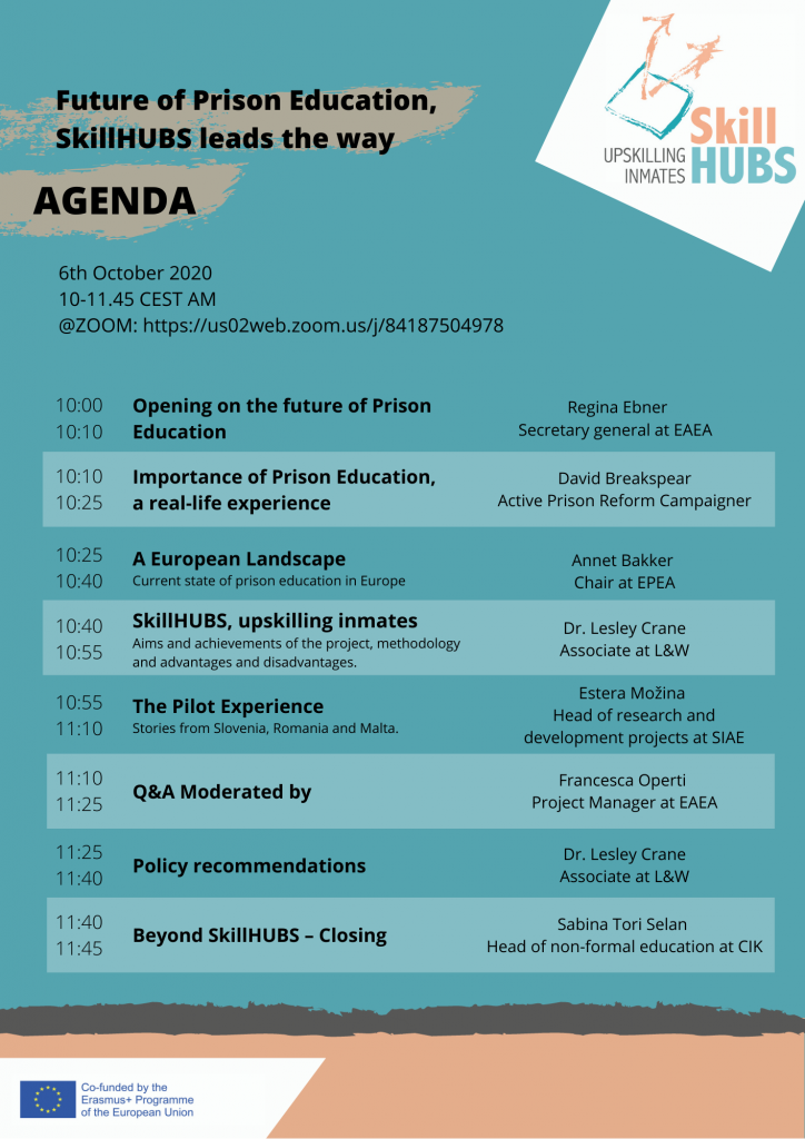 Evropsko združenje za izobraževanje odraslih – EAEA bo 6. oktobra gostilo virtualno zaključno konferenco projekta SkillHUBS z naslovom Prihodnost izobraževanja v zaporih, SkillHUBS usmerja pot (Future of Prison Education, SkillHUBS leads the way).