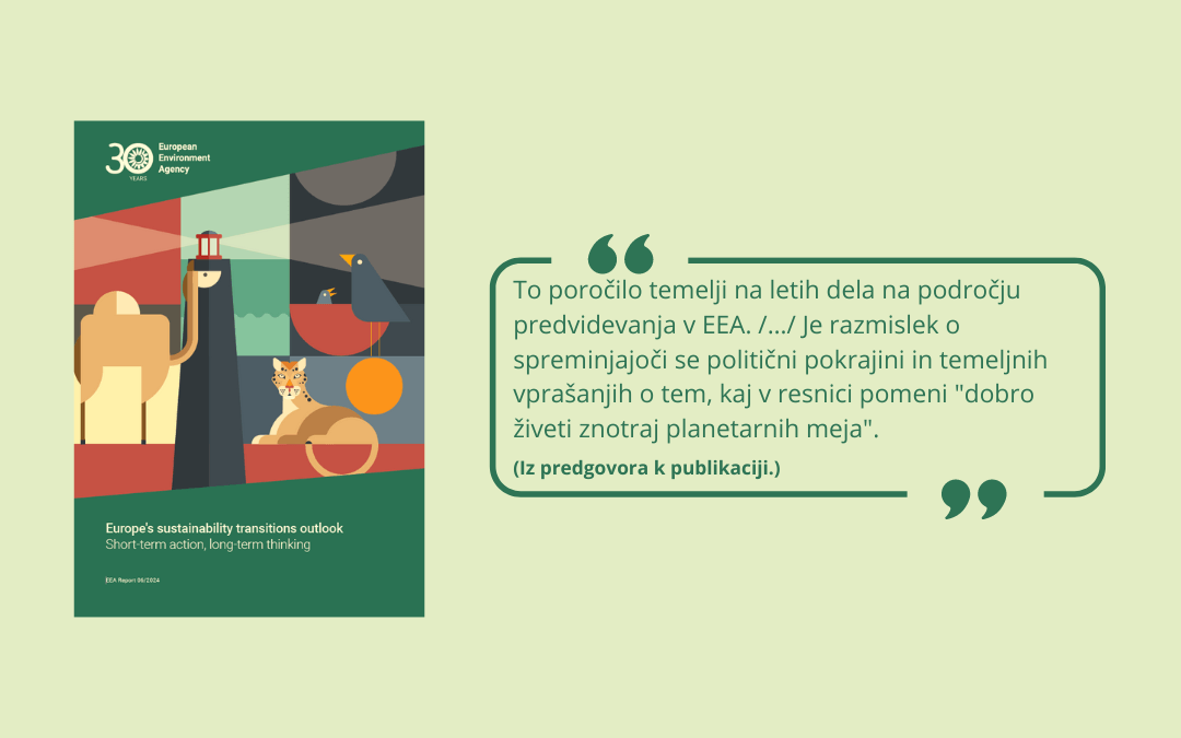 Evropska agencija za okolje (EEA) je izdala publikacijo z naslovom Europe’s Sustainability Transitions Outlook. Odgovarja na vprašanje, kako lahko EU doseže svoje cilje trajnostnega razvoja v kontekstu globalne polikrize. Na splošno ta izraz opisuje preplet ekonomskih, socialnih, geopolitičnih in okoljskih kriz, ki skupaj ustvarjajo sistemska tveganja za svet, kot ga poznamo. Ne glede na sam izraz se prizadevanja EU za prehod na trajnost zdaj odvijajo v takšnem kontekstu. Prav zato je izvajanje okoljske politike pod pritiskom in zahteva ravnotežje med kratkoročnimi odzivi in dolgoročnimi trajnostnimi cilji.
