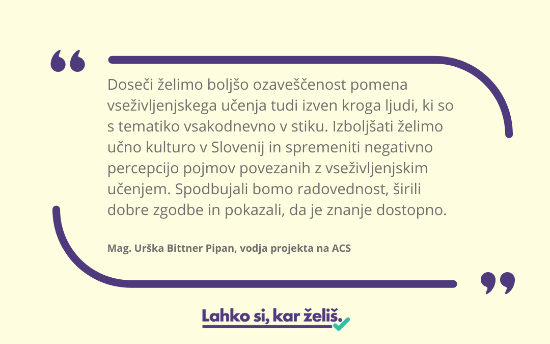 Znanje je nekaj, česar nam nihče ne more vzeti. Prav pomen pridobivanja ustreznega znanja, spretnosti in kompetenc na vseh ravneh in v vseh obdobjih našega življenja, bo eno od vodil našega novega projekta Ozaveščanje, obveščanje različnih javnosti in spodbujanje k večji vključenosti v vseživljenjsko učenje (krajše Ozaveščanje za VŽU). Projekt je nastal kot nadgradnja vseh dosedanjih prizadevanj za boljšo ozaveščenost vseživljenjskega učenja.