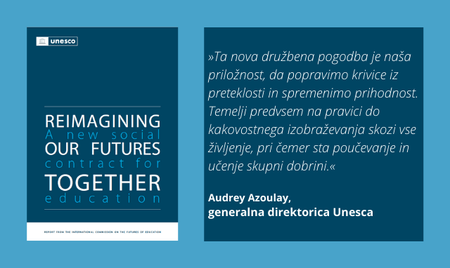 Poročilo UNESCO o prihodnosti izobraževanja z naslovom Reimagining our futures together: a new social contract for education temelji na zahtevi po novi družbeni pogodbi za izobraževanje.