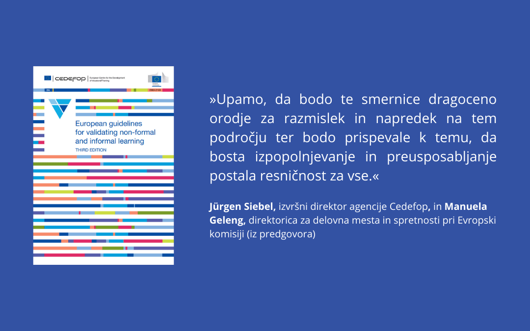 Tretja izdaja smernic (European guidelines for validating non-formal and informal learning), ki je izšla konec maja, nadgrajuje prejšnji izdaji iz leta 2009 in 2015. Zajema tudi vrednotenje priporočil in nadaljnje ukrepe.