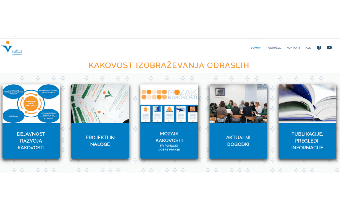 Spletne strani dejavnosti Kakovost izobraževanja odraslih, ki jo razvijamo na ACS, smo prenovili. O tem se lahko prepričate tudi sami z virtualnim obiskom na že znanem naslovu: https://kakovost.acs.si. Obstoječe vsebine smo preoblikovali ter jih razvrstili v drugačno osnovno strukturo, kot smo bili vajeni do sedaj. Nekaj projektov v zvezi s kakovostjo, ki se trenutno izvajajo, pa smo na novo predstavili. Področje Kakovost izobraževanja odraslih smo razdelili na naslednje temeljne vsebinske sklope: