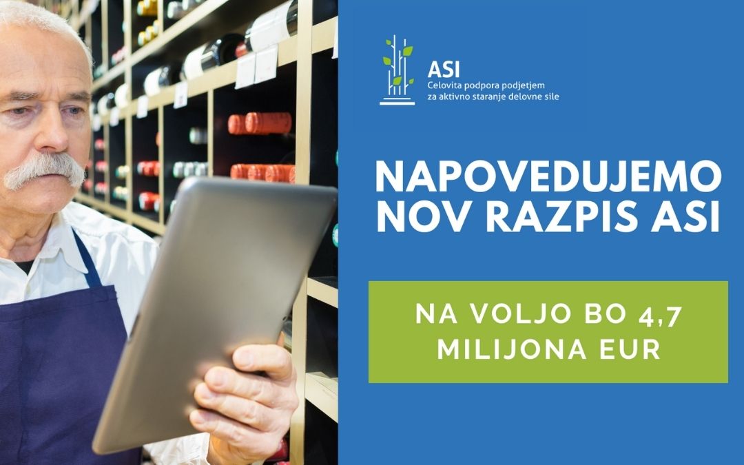 Predvidoma v petek, 16. aprila 2021, bo objavljen nov razpis v okviru projekta Celovita podpora podjetjem za aktivno staranje delovne sile – ASI, na katerem bodo podjetja lahko pridobila sredstva za usposabljanja svojih starejših zaposlenih, s poudarkom na usposabljanjih iz digitalnih veščin.