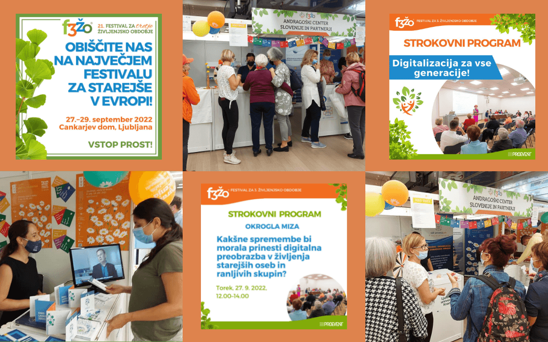 Andragoški center Slovenije in partnerji se bomo na letošnjem Festivalu za tretje življenjsko obdobje – F3ŽO predstavljali že desetič zapovrstjo. Med 27. in 29. septembrom nas obiščite na razstavnem prostoru v prvem preddverju Cankarjevega doma. Predstavili vam bomo naše dejavnosti in izdelke, ki so povezani z aktivnim staranjem in medgeneracijskim sodelovanjem, ter vas skušali spodbuditi k vseživljenjskemu učenju.