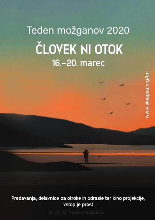 Tema in naslov letošnjega Tedna možganov je Človek ni otok. Med 16. in 20. marcem ste vabljeni na predavanja, delavnice in ogled filmov, ki jih pripravlja Slovensko društvo za nevroznanost – Sinapsa. Z dogodki bodo osvetlili odnose, s katerimi se srečujemo vsak dan in so temelj našega obstoja.