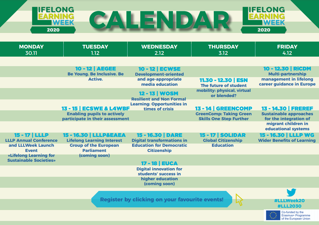 Letos boste lahko Teden vseživljenjskega učenja spremljali na spletu, iz udobja svojih domov. 13 glavnih dogodkov vas bo popeljalo skozi glavno temo – Vseživljenjsko učenje za trajnostne družbe.