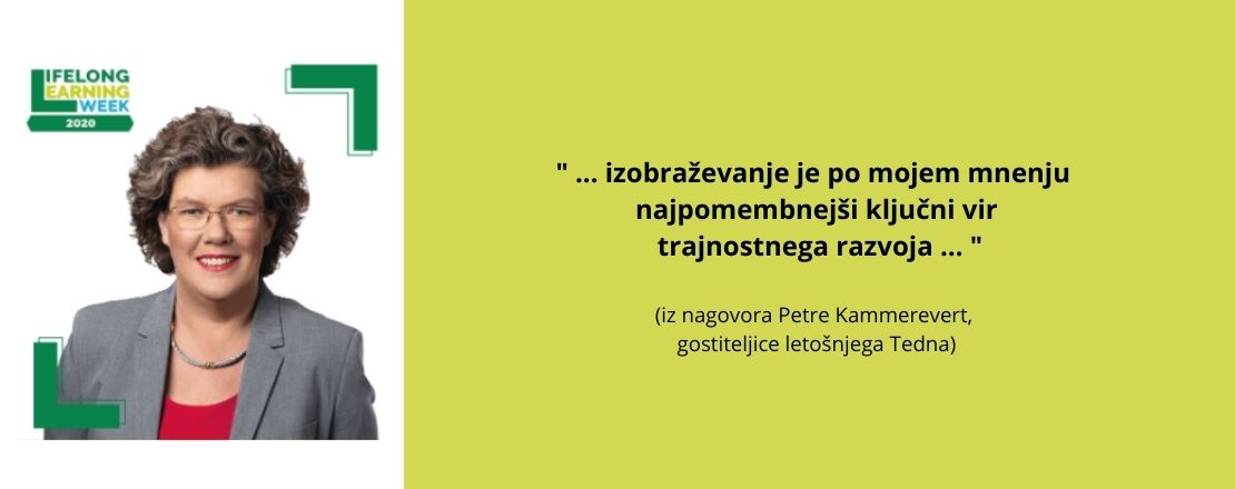 Platforma za vseživljenjsko učenje (Lifelong Learning Platform – LLL Platform) bo od 31. novembra do 4. decembra 2020 organizirala svoj 10. Teden vseživljenjskega učenja (LLLWeek). Ob tem jubileju bo Teden gostila evropska poslanka Petra Kammerevert, nekdanja predsednica in sedanja članica Odbora za kulturo in izobraževanje (CULT). Vabimo vas, da preberete njen nagovor.