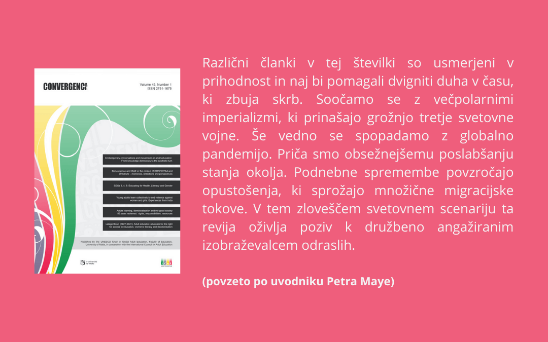 Skoraj dvanajst let je minilo od izida zadnje številke revije Convergence. Vsi poskusi, da bi v tem času našli založnika, so se izjalovili. Šele letos je Univerza na Malti prek svoje Pedagoške fakultete le prevzela pobudo za nadaljevanje izhajanja te revije in kritje s tem povezanih finančnih stroškov. V sodelovanju z Mednarodnim svetom za izobraževanje odraslih (ICAE) je zagotovila tudi uredniško podporo.