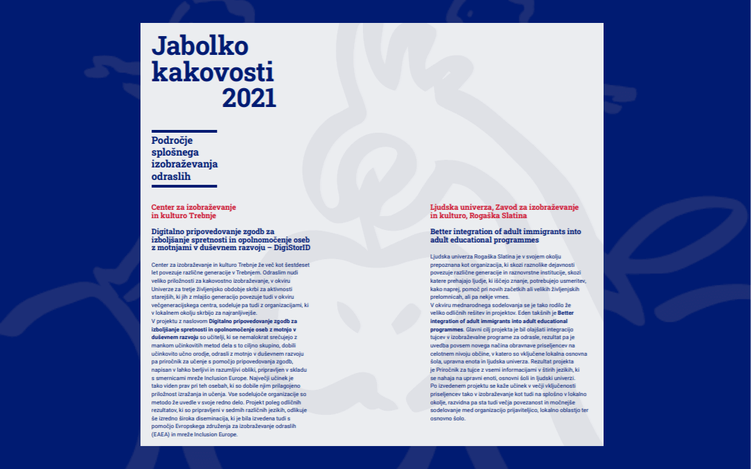 Jabolka kakovosti so prejeli najboljši projekti v okviru programa Erasmus+ iz treh sektorjev izobraževanja, in sicer v splošnem šolskem izobraževanju , v sektorju poklicno in strokovno izobraževanje in v izobraževanju odraslih. Med slednjimi sta
