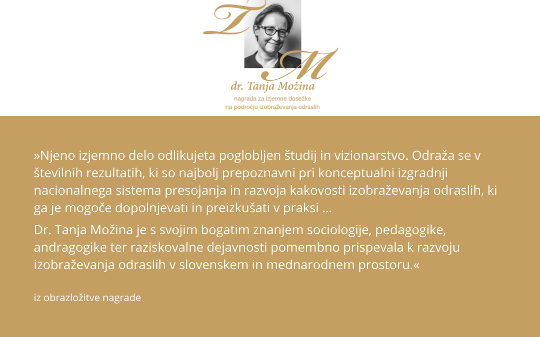 Med desetimi nagrajenci je tudi naša sodelavka dr. Tanja Možina, ki je bila nagrajena za izjemne dosežke na področju izobraževanja odraslih.