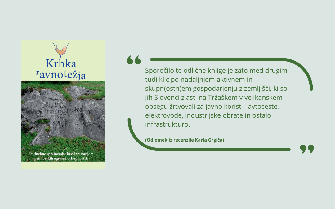 Knjigo je lani izdal Andragoški center Slovenije. Prikazuje primarne podatke o obstoju agrarnih skupnosti, o vremenu na različnih primorskih lokacijah in nadmorskih višinah ter o članih agrarnih skupnosti. Obenem spregovori o odzivu slovenskih gozdnih združb na podnebne spremembe na Primorskem (alpski in sredozemski del Slovenije), analizira in k izobraževanju spodbuja novo, v izobraževalni praksi redko videno ciljno skupino.