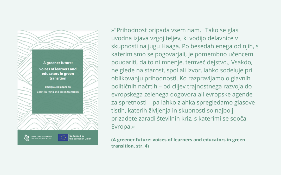 Druga publikacija, ki jo predstavljamo, je informativni dokument z naslovom A greener future: voices of learners and educators in green transition (Bolj zelena prihodnost: glasovi učencev in vzgojiteljev v zelenem prehodu).