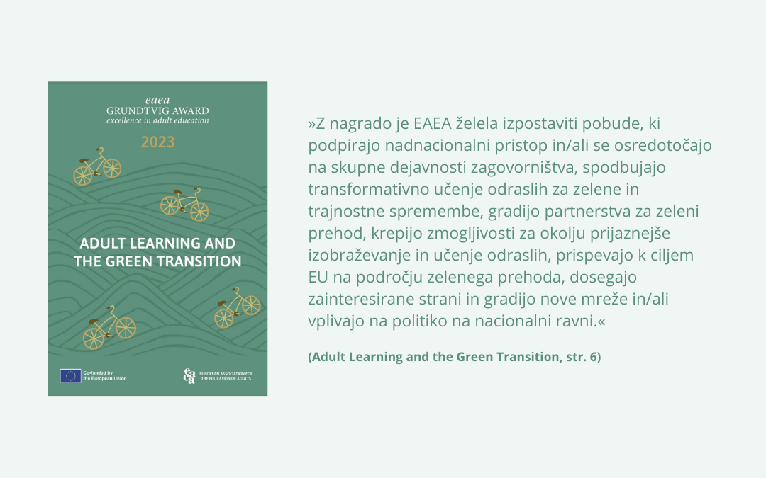 Evropsko združenje za izobraževanje odraslih – EAEA je je izdalo dve publikaciji o izobraževanju odraslih in zelenem prehodu. Prva prav s tem naslovom (Adult Learning and the Green Transition) je publikacija o nagradi EAEA Grundtvig Award 2023.