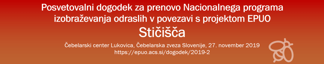 Vabimo vas na nov posvetovalni dogodek, ki smo ga poimenovali Stičišča. 27. novembra med 8.30 in 14.45 gostimo v Čebelarskem centru Lukovica zanimive goste (program): prof. dr. Ana Krajnc in mag. Peter Beltram bosta povzela ključne ugotovitve LPoIO in si z nami delila svoje poglede nanje; mag. Samo Milič Hribar in Tanja Skaza bosta s svojima prispevkoma osvetlila pomen izobraževanja in usposabljanja za delo; Irena Kuntarič Hribar si bo z nami delila izkušnje s projektom ESS Dvig izobrazbene ravni, ki odrasle vabi k pridobivanju formalne izobrazbe; Marija Imperl in Jože Prah pa bosta spregovorila o pomenu splošnega neformalnega izobraževanja odraslih – za posameznika, skupnost in trajnostni razvoj.