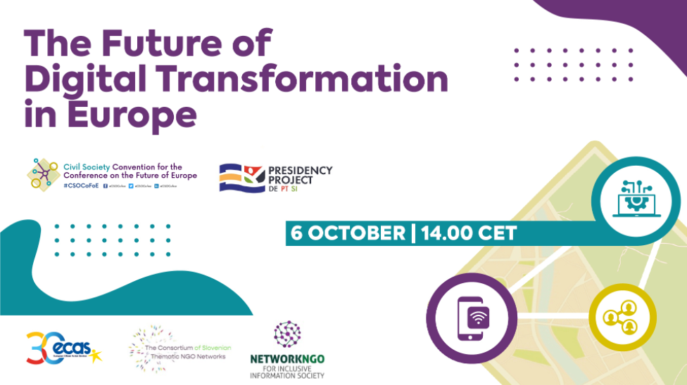 European Citizen Action Service (ECAS), Konzorcij vsebinskih mrež NVO Slovenije in Mreža nevladnih organizacij za vključujočo informacijsko družbo (NVO-VID) vabijo na spletni dogodek z naslovom Prihodnost digitalne preobrazbe v Evropi, ki bo v sredo, 6. oktobra, med 14. in 15.30. Dogodek poteka v okviru Konference o prihodnosti Evrope in se navezuje na predsedovanje Slovenije Svetu EU.
