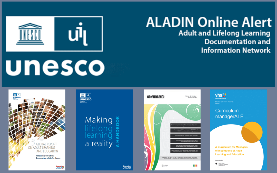 Nova, 42. številka spletnega glasila ALADIN Online Alert, ki ga pripravlja Inštitut za vseživljenjsko učenje pri UNESCO (UIL), prinaša povezave do pomembnih publikacij, ki so nastale v zadnjem obdobju. Najdete jih v tradicionalnih rubrikah: Izobraževanje odraslih, Pismenost odraslih, Vseživljenjsko učenje ter Poklicno in strokovno izobraževanje in usposabljanje.
