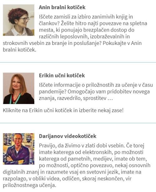 S prenovljeno spletno stranjo želimo med drugim spodbuditi k učenju in delovanju. Vabimo vas k ogledu Aninega bralnega in Erikinega učnega kotička, Darijanovega videokotička, Francijevega čarunalniškega ter Matejinega spletnega kotička.