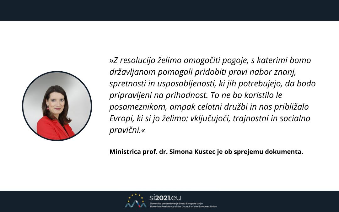 K resoluciji je pomembno prispevala tematska konferenca slovenskega predsedstva na temo izobraževanja odraslih, ki je bila 8. in 9. septembra (Adult Learning and Education – The Resilient Response to Future Challenges. Paving the Way to CONFINTEA VII in 2022). Na njej so udeleženci soustvarjali deklaracijo o prihodnosti učenja in izobraževanja odraslih (Declaration on Adult Learning and Education by 2030 in European Union). Ta upošteva priporočila in strokovne zaveze za spodbuditev vseživljenjskega učenja, ki bo omogočalo prilagodljivo in personalizirano učno pot.