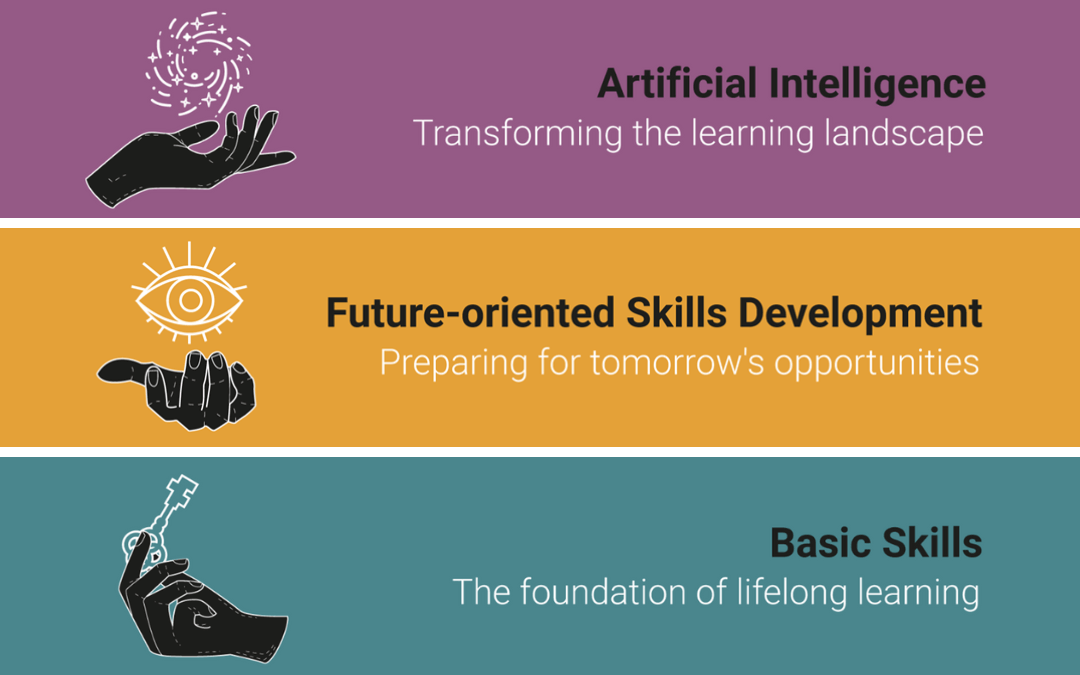 V času hitrega tehnološkega napredka in spreminjajočih se zahtev po delovni sili EPALE izpostavlja tri ključne tematske sklope. Odražajo prednostne naloge Evropske komisije za obdobje 2024–2029.