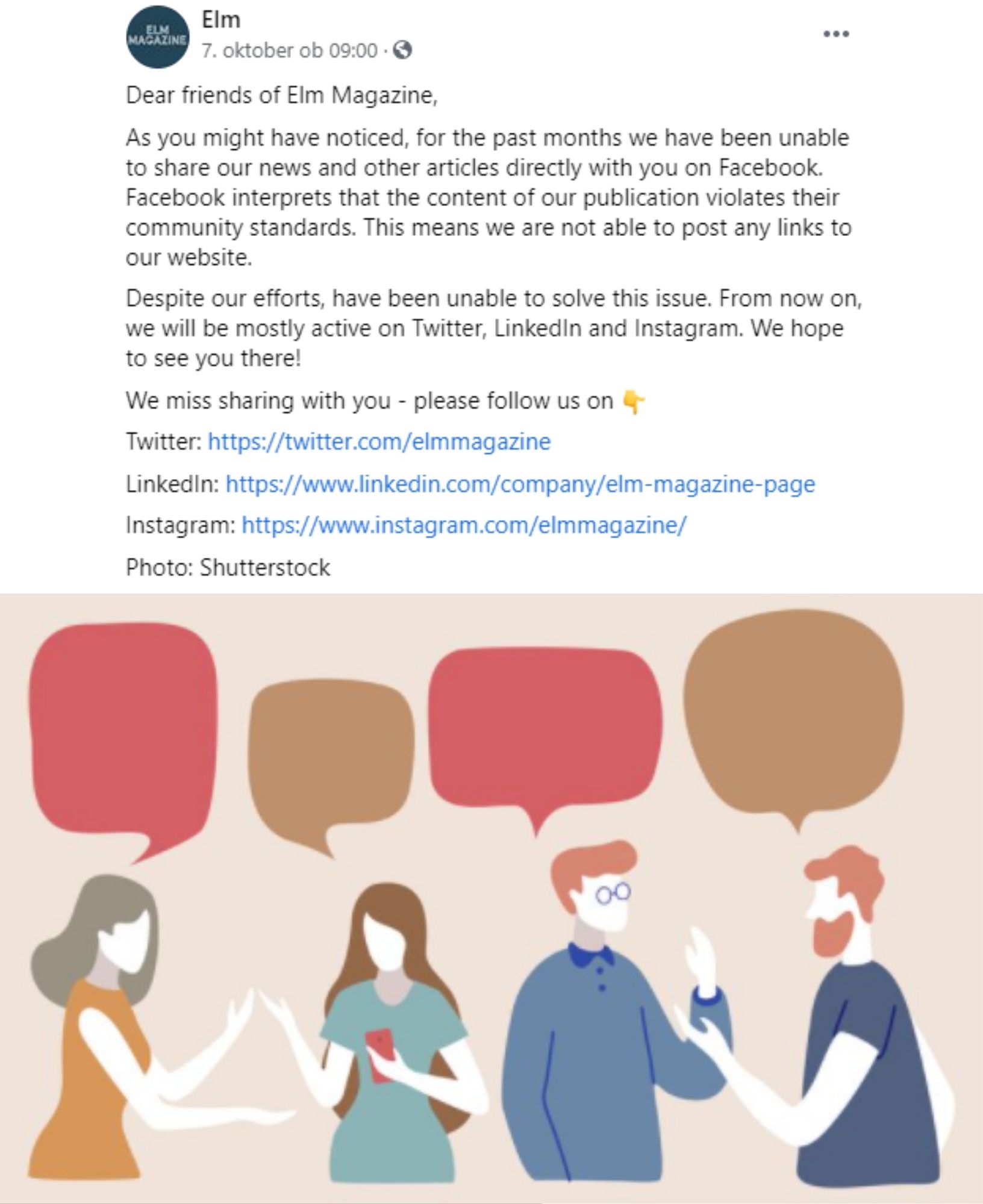 Naj ob tem povzamemo še objavo na Facebook strani Elm Magazine. V zadnjih mesecih na svojem FB profilu niso mogli deliti svojih novic in drugih člankov. Facebook je na njihov ugovor odgovoril, da vsebina publikacije krši njihove standarde skupnosti. To pomeni, da ne morejo objaviti nobene povezave do spletnega mesta Elm Magazine.