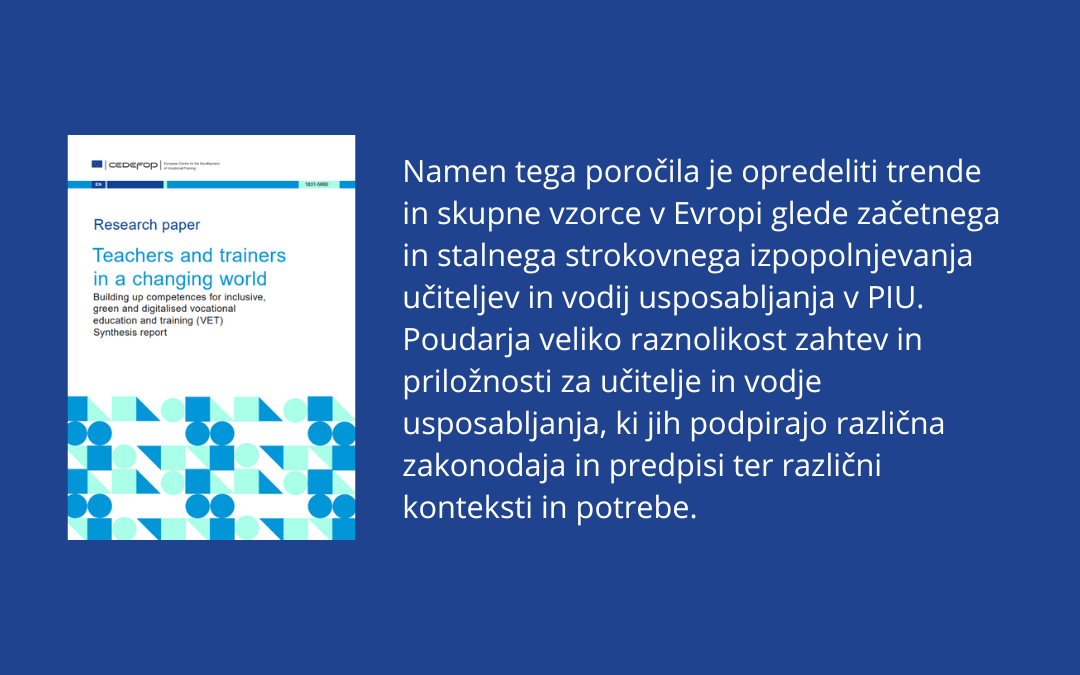 Zbirno poročilo s podnaslovom Pridobivanje kompetenc za vključujoče, zeleno in digitalizirano poklicno izobraževanje in usposabljanje (PIU) opredeljuje nedavne trende in razvoj politike v Evropi na področju začetnega in stalnega strokovnega razvoja učiteljev in vodij usposabljanja v PIU.