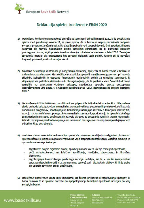 Udeleženci konference EBSN 2020 podpirajo vsa priporočila 4. točke Talinske deklaracije, ki so namenjena oblikovalcem politik za zagotavljanje ustreznega in trajnostnega sisteme financiranja programov za pridobivanje temeljnih znanj in spretnosti, financiranja raziskav tega področja ipd.
