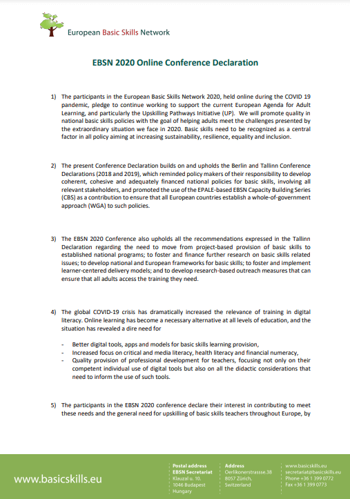 Udeleženci konference želijo prispevati k izpolnjevanju teh potreb na različne načine: z razvojem projektnih aplikacij in različnih izobraževalnih virov, namenjenih izpopolnjevanju učiteljev temeljnih spretnosti po vsej Evropi. Zavedajo se globalne razsežnosti izzivov, s katerimi se trenutno soočamo, zato podpirajo Unescovo globalno zavezništvo za pismenost (GAL), ki se mu je nedavno kot pridružena članica priključila tudi mreža EBSN.
