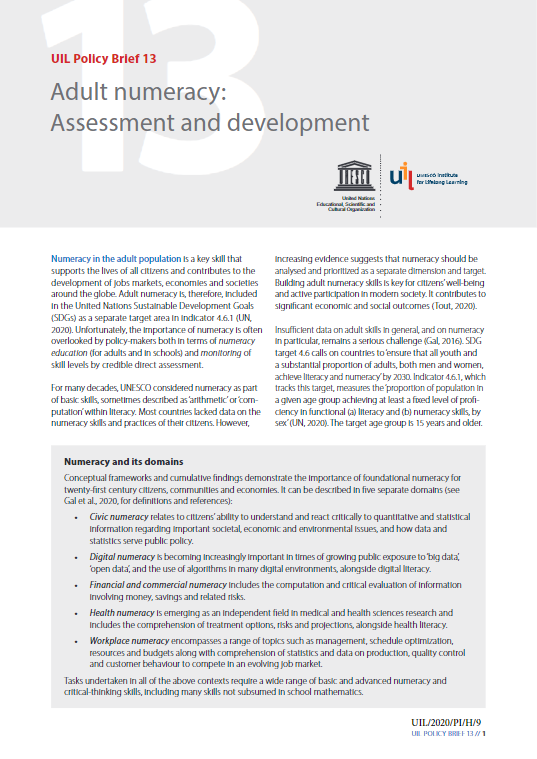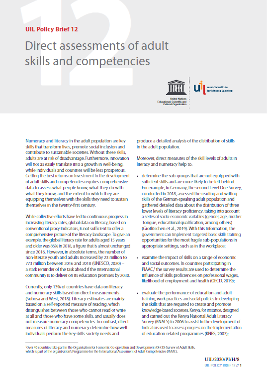 Prvi z naslovom Direct assessments of adult skills and competencies se osredotoča na neposredne ocene spretnosti in kompetenc odraslih. Besedilne in matematične spretnosti odraslih so ključne za preobrazbo življenja, spodbujanje socialne vključenosti in prispevek k trajnostnim družbam. Da bi dosegli čim večji učinek vlaganja v razvoj spretnosti in kompetenc odraslih, je treba zbrati izčrpne podatke, s katerimi bodo ocenili, kaj ljudje vedo, kaj počnejo s tem, kar vedo, in v kolikšni meri so sposobni preživeti v 21. stoletju. Podrobnosti najdete na spletni strani UIL.