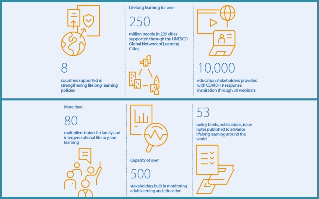 Leta 2020 je UIL sodeloval z 229 člani Unescove globalne mreže učnih mest, da bi vseživljenjsko učenje vključili v svoje načrte za ukrepanje ob nesrečah. Inštitut je še naprej sodeloval pri spodbujanju pismenosti. Imel je pomembno vlogo pri krepitvi zmožnosti oblikovalcev politiki n drugih deležnikih za izvajanje programov družinske pismenosti ter še dodatno okrepil Unescovo globalno zavezništvo za pismenost (GAL).