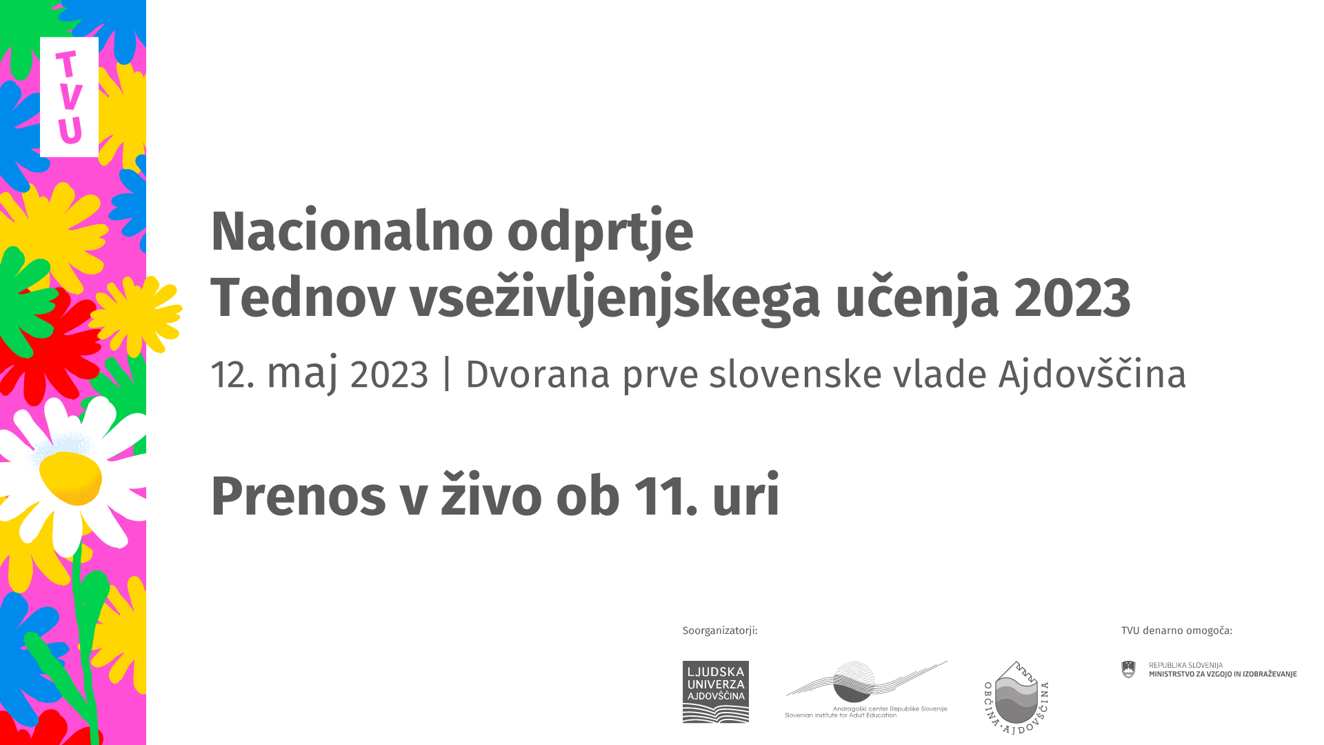 V petek, 12. maja, bomo TVU 2023 slovesno odprli v Ajdovščini. Pri njegovi organizaciji sta moči združili Ljudska univerza Ajdovščina in Andragoški center Slovenije. Na prizorišče – Dvorana prve slovenske vlade – vabimo ob 11. uri.