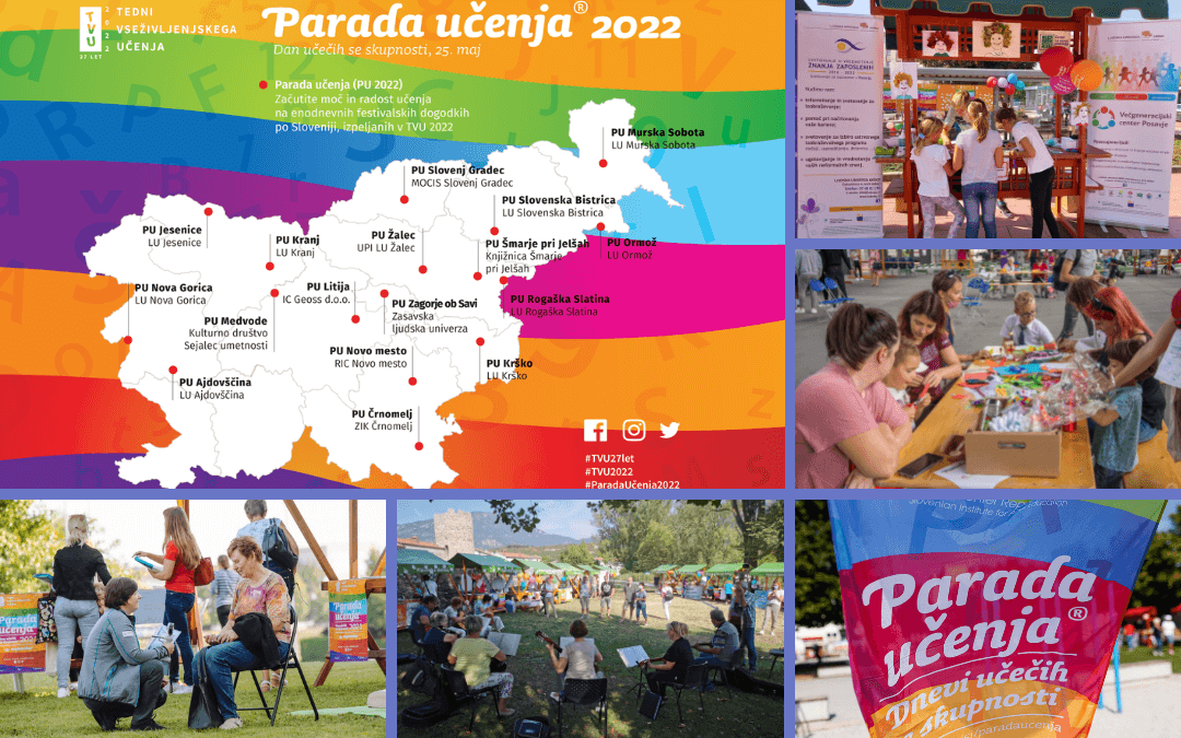 Podobo Tednov vseživljenjskega učenja – TVU 2022 bodo vse do 12. junija krojile tudi skupne akcije. Med njimi je stalna akcija Parada učenja – Dan učečih se skupnosti, ki jo bomo na 17 prizoriščih po Sloveniji obeležili v sredo, 25. maja.