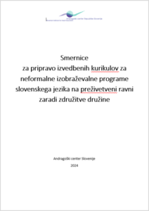 V letu 2023 smo pripravili strokovno gradivo za pripravo izvedbenih kurikulov v neformalnih, najmanj 240-urnih izobraževalnih programih slovenskega jezika za odrasle. Smernice so bile razvite za uresničevanja neformalnih programov učenja slovenščine za namene združitve družine, kot to opredeljuje 2. člen Zakona o spremembah in dopolnitvi Zakona o tujcih. Ti programi se izvajajo z namenom razvijati zmožnosti najbolj temeljnega sporazumevanja v slovenščini kot neprvem jeziku. Ta na novo priseljenim osebam omogoča preživetje v ponovljivih, rutinskih situacijah in ob vsakodnevnih opravilih (npr. nakupi in druge storitve, obisk pri zdravniku). Izvajalci pri pripravi izvedbenega kurikula smiselno sledijo tudi Izhodiščem za pripravo javnoveljavnih programov za odrasle.